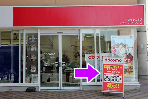 立て看板に『au・SoftBankから番号そのままでお乗り換えなら、25,000円環現!!』の文字が! イー・モバイルや日本通信からのMNPは?というツッコミはさておき、四国・福岡ではキャッシュバック▲20,000円ですが、岡山ではキャッシュバックが▲5,000円の増額です。